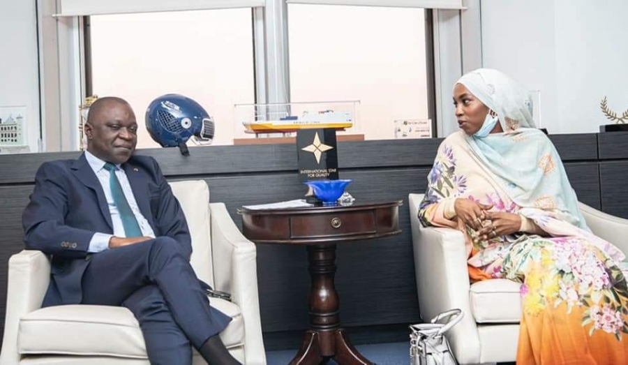 Présente en Côte d'Ivoire dans le cadre du Forum Africain des Infrastructures qui s'ouvre ce jeudi 25 novembre 2021 à Abidjan, la Ministre des Transports et de la Sécurité Routière du Tchad, Fatim Goukouni Weddeye a été reçue par son homologue ivoirien Amadou Koné, Ministre des Transports. C'était ce mercredi 24 novembre 2021 au 21ème étage de l'immeuble Postel 2001.